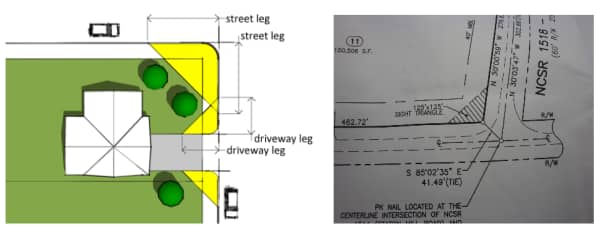 You may have seen a Site Plan that sectioned off a small area and labeled it "Site Triangle." That's a great idea, but many argue it's spelled wrong. It's understandable because the area is usually triangular and located on a "site." But in this case, the dedicated area is all about vision. A "Sight Triangle" is an area at an intersection or driveway entrance that should remain clear of visual obstructions so drivers can see oncoming traffic and pedestrians and vice versa. The area might also be labeled as a "Visibility Triangle" or "Clear Vision Area." Here's an example of obstructed visibility coming out of a private drive and at the street corner. Typically, most local zoning ordinances do not require a Sight Triangle for one- and two-family dwellings. Neither does the building code, so it's not an item on the AIBD CD Checklist. For now. Yes, the landscaping looks beautiful. And homeowners deserve to have privacy. In a small town that has seen its share of accidents, you may uncover a requirement as an unexpected surprise—like an "Easter Egg"—when you diligently review the zoning code. So, here's one way a private property owner or a city might resolve the issue and provide for safe roadway travel. It's called a Jumbo Convex Safety Mirror, and its price ranges between $350 and $500, depending on size, which varies from 13 inches to 48 inches in diameter. Here is an affordable alternative: When creating the Site Plan, designate an area, hatch it, and label it as a 10' x 25' (size should depend on the roadway) Sight Triangle (or Clear Sight Triangle, Clear Vision Area, etc.). Then, include a note describing the triangle's purpose and restrictions. Such as, "Any fence, Hedge, or other object which will cause a sight visibility obstruction between 30" and 96" inches above grade must be located outside of this designated triangular area." Other examples you might find in local ordinances could be as high as 36 inches and 10 feet above grade. The key is to establish an unobstructed area for people sitting in a vehicle, riding a bike, or walking to view potential danger in every direction. An area above ground cover and below the lower branches of a tree. Here are two examples. If the building site is located on a corner or an intersection, a larger Site Triangle, such as 25' x 25', might be considered depending on the speed limit of the roadways and if there's a stop sign. The triangle size for a driveway should also consider whether the homeowners will likely be backing out or leaving the property facing forward. Here is a wonderful illustration shared by Durango, Colorado (left). Another on the right gives us an idea of how to depict the area on a construction drawing. While not a requirement in most cases, clearly depicting sight triangles on construction plans is a best practice that building designers should prioritize. By doing so, you help ensure that all project stakeholders are aware of the safety requirements for maintaining clear visibility, particularly at driveways. This ultimately prevents obstructions that could jeopardize a child or pet that runs into the street unexpectedly or the student driver pulling out for the first time, among others. Ensuring safety and visibility, PS - If you'd like to view some examples of "official" zoning regulations relating to sight triangles on residential sites, St Petersburg, FL, has prepared a two-page PDF document instructing designers in their area, and the ordinance enforced by Weston, FL, is available online. |